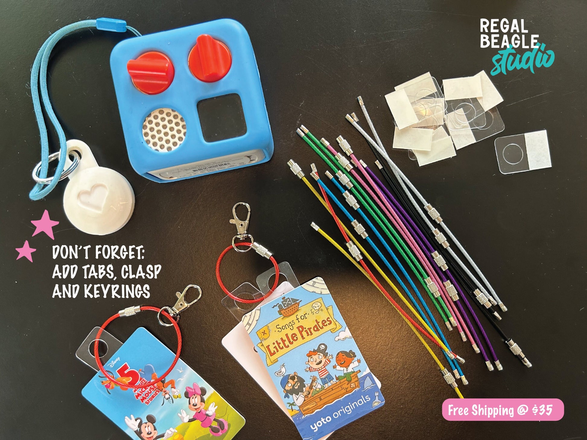 Use this printed tier stand to store your mini music player and cards with the tab system, key ring, and headphone stand. This design allows your little one to keep all the various tab cards together in an organized way. The headphone comes as a separate piece for easy shipping, and you slide it on the dock for a secure fit. As a reminder chargers should only be handled by an adult and charged out of reach of children. Measurement is approx in the photo.